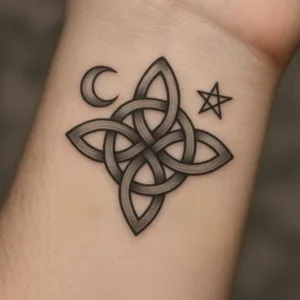Muchos lo combinan con lunas, pentáculos o símbolos wiccanos. Si el cliente viene con esa idea, toca asesorar bien. No todo encaja. El equilibrio visual en este diseño es clave.